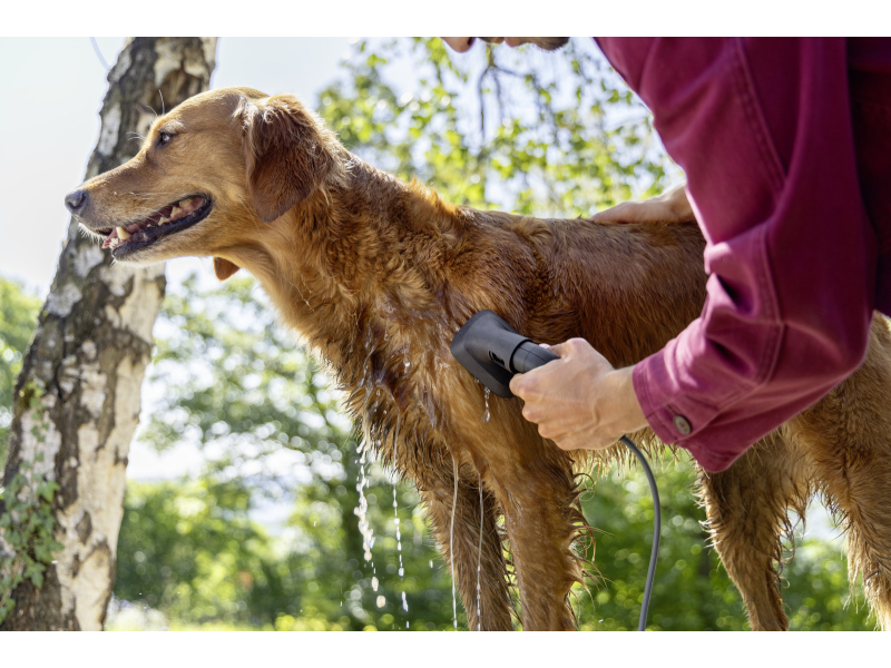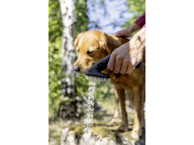 Kartáč je ideální pro rychlé opláchnutí tlapek po procházce, ale stejně dobře poslouží i při čištění celé srsti. Voda je dávkována pouze při stisku spouště, což znamená úspornou spotřebu vody, delší výdrž baterie a možnost použití i mimo domov – například před nasednutím do auta nebo po návratu z výletu.