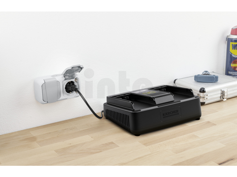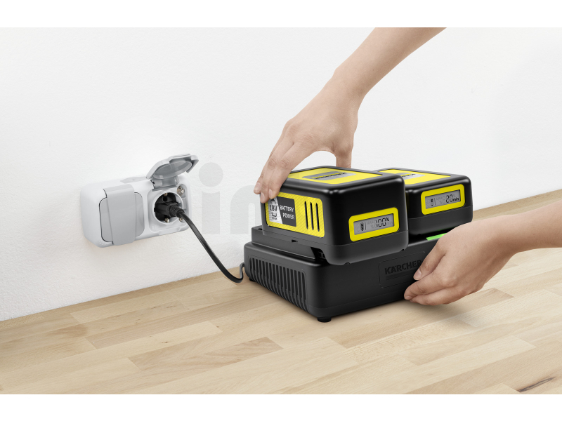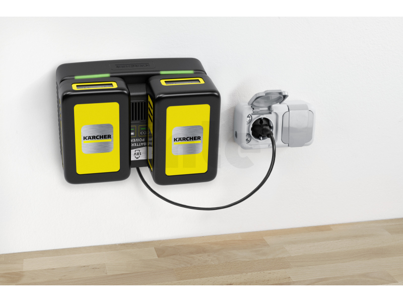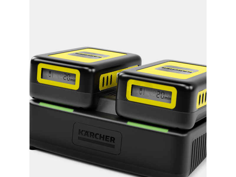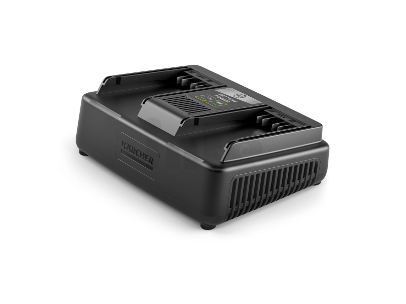 - Kompaktní konstrukce se 2 sloty na baterie umožňuje paralelní nabíjení dvou 18 V výměnných baterií Kärcher Battery Power.