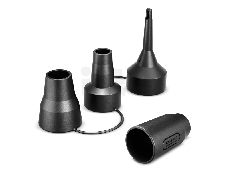 Součástí balení je adaptér pro bezpečné připojení k sací hadici a tři velikosti trysek (S, M, L) kompatibilní s ventily různých typů nafukovacích produktů. Díky tomu je nafukovací sada Kärcher WD maximálně univerzální a vhodná pro široké spektrum použití v domácnosti, na zahradě i při kempování.