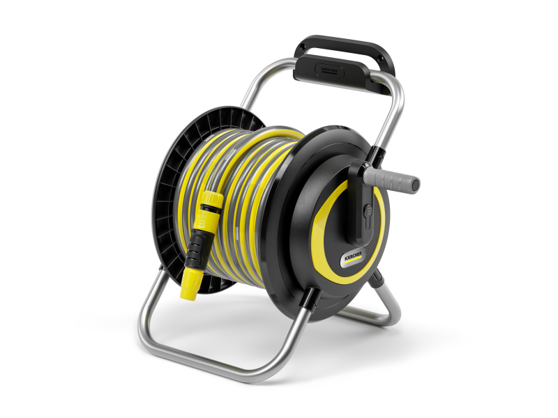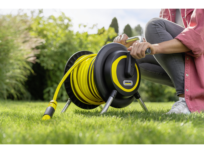 Naviják vyniká kompaktní konstrukcí, nízkým těžištěm a vysokou stabilitou, což zajišťuje bezpečnou manipulaci i při častém používání. Materiály jsou odolné vůči UV záření i mrazu, takže zařízení nabízí dlouhou životnost při celoročním venkovním použití. Kärcher poskytuje záruku 5 let, která potvrzuje vysokou kvalitu a spolehlivost produktu. Naviják je dodáván kompletně smontovaný a připravený k použití.