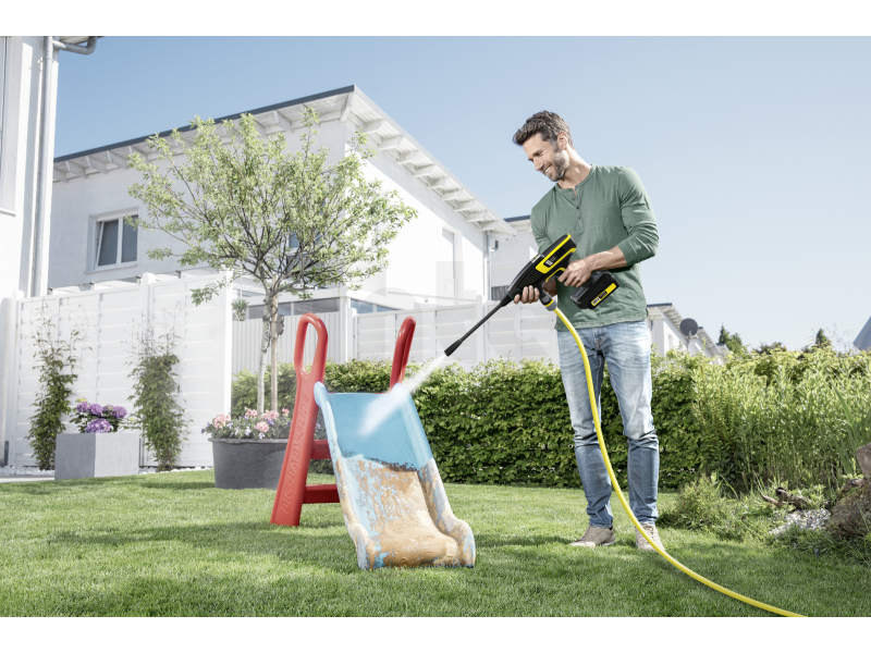 Mobilní nízkotlaký bateriový čistič KÄRCHER KHB 6 pro efektivní čištění zahradního nábytku, houpaček atd. Čistič je dodáván včetně 18 V baterie a nabíječky.
