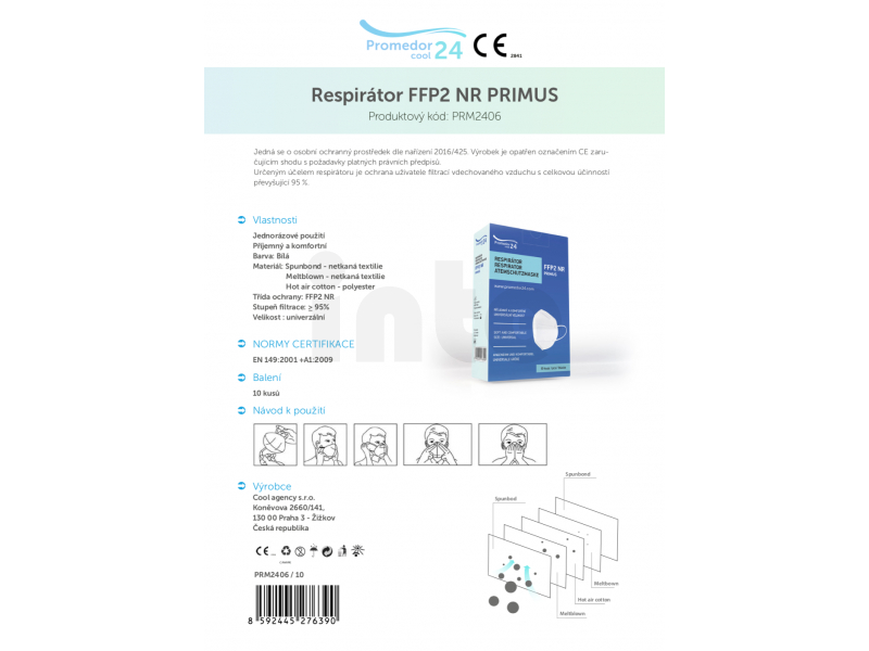 Chraňte sebe i ostatní! Respirátor FFP2 PRIMUS je určený k ochraně jeho uživatele filtrací vdechovaného vzduchu a ke snížení rizika infekce mezi osobami. Je vytvořen z bavlny a netkané textilie s pružnými pásky k uchycení za uši. Díky příjemnému materiálu a tvaru, který nenaléhá přímo na ústa a je velice komfortní. Pětivrstvá ochrana splňuje kritéria třídy FFP2 a účinnost filtrace je nejméně 95 %. Jedná se o osobní ochranný prostředek dle nařízení 2016/425. Jednorázové použití.