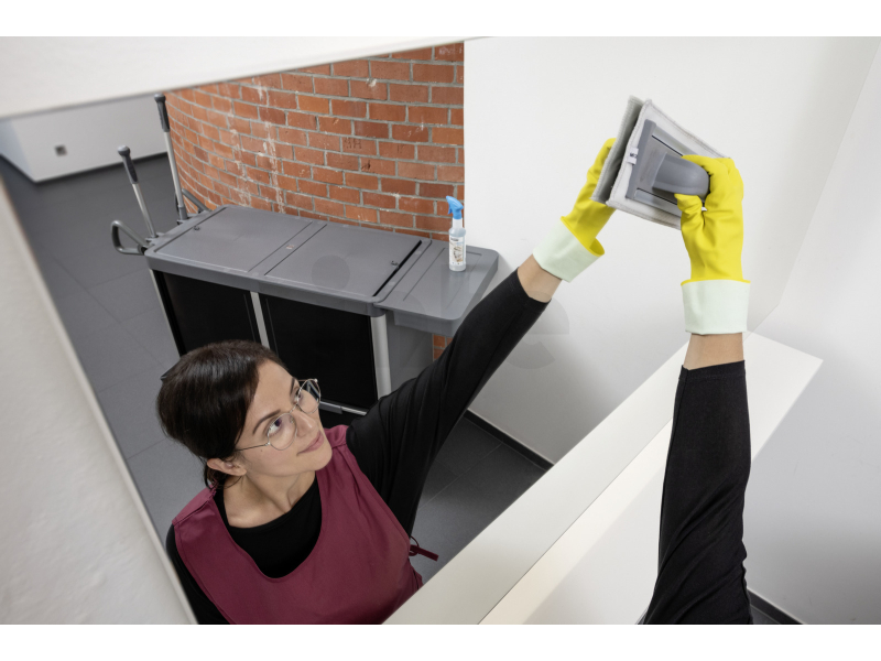 Úklidový vozík FlexoMate ExpertPro 100/P s uzavřenou konstrukci a prodlouženou základovou deskou je skvělý pomocník pro čištění prostor citlivých na hygienu a pro použití metody čištění předpřipravenými mopy. Integrovaný odpadní modul pojme odpadkové pytle různých velikostí a otevírá se nožním pedálem. Další vybavení lze uložit do čtyř 6litrových kbelíků a uchovávat je odděleně v závislosti na oblasti použití. Pro ještě více úložného prostoru má vozík také dvě další zásuvky s kapacitou 16 a 32 litrů. Lze je umístit podle potřeby a jsou vhodné pro přenášení čisticích pomůcek a stroje jako EB 30/1 Bp Li-Ion lze snadno připevnit na vnější strany FlexoMate pomocí dodaných spojů FlexoLink. FlexoLink XL lze použít k připevnění výstražného štítku nebo WVP 10 Adv. Dveře a boční panely lze personalizovat pomocí samolepek. Dvě brzdy zajišťují vozík na místě i na svažitém terénu. Ergonomicky tvarovaný FlexoGrip snižuje namáhání paží a ramen při tlačení. Dveře Push-to-open lze individuálně nastavit pro praváky nebo leváky.
