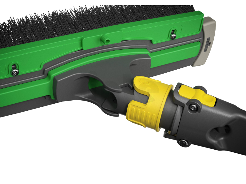 Kartáč je navržen s důrazem na bezpečnost a komfort při práci. Celoplošná ochrana proti nárazům chrání citlivé povrchy před poškrábáním a zároveň snižuje hluk při kontaktu s fasádou. Praktický otočný zámek (swivel lock) umožňuje snadné nastavení úhlu a pohodlnou manipulaci při práci ve výškách.