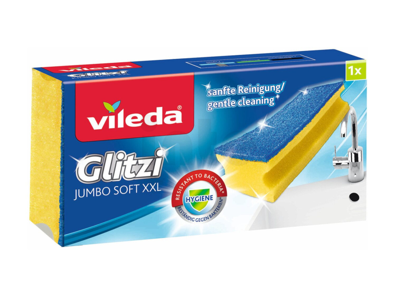 Vileda Glitzi Always Clean viskózní houbička s PUR aktivní vrstvou a viskózním materiálem odstraní i ty nejodolnější nečistoty a po opláchnutí je čistá a jako nová.