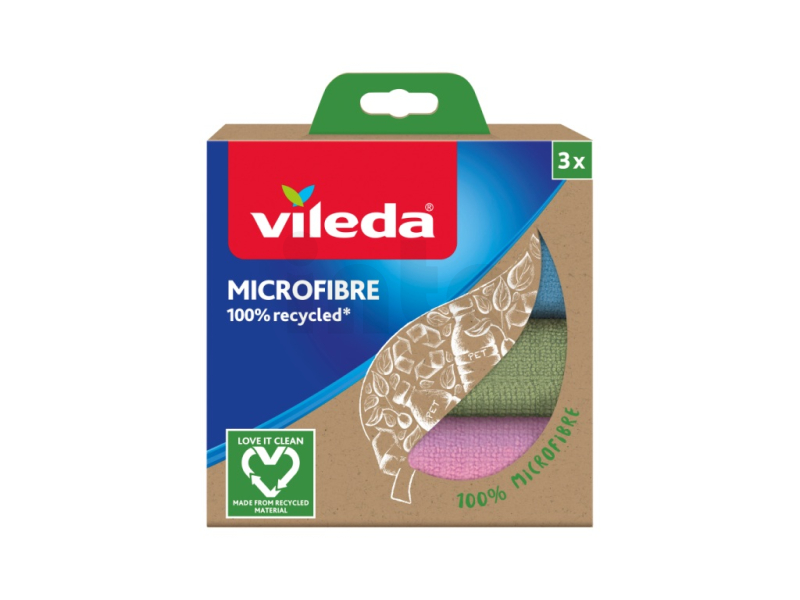 Mikrohadřík Vileda nezanechává žádné kapky ani šmouhy a je vyrobený ze 100% recyklovaného materiálu