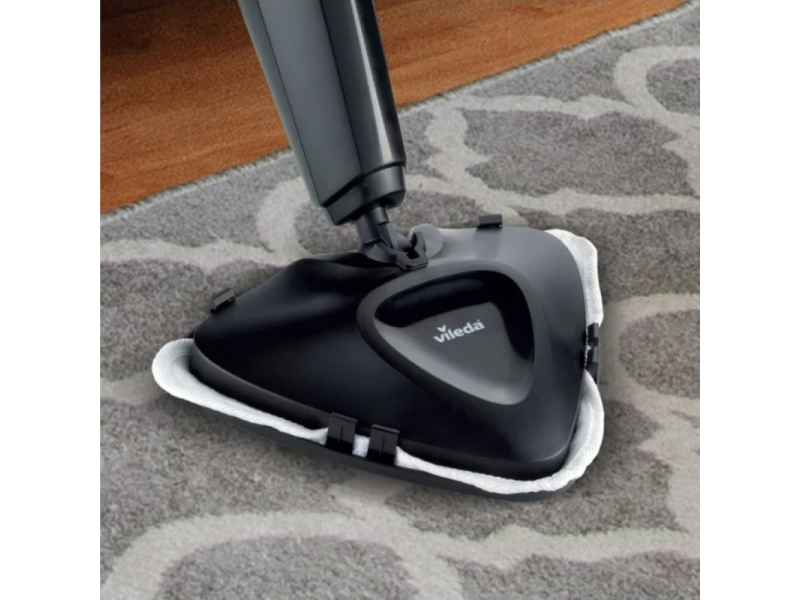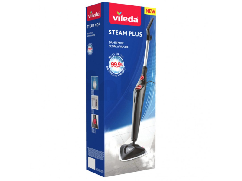 Nově navržený Vileda Steam PLUS parní mop má vysoký výkon a je snadno ovladatelný, kompaktní, lehký a vybaven otočnou trojúhelníkovou hlavicí mopu. Je dlouhý 126 cm a váží 2,3 kg. Ergonomická rukojeť umožňuje snadné a pohodlné držení parního mopu. Díky jeho kompaktnímu tvaru a konstrukci snadno a rychle klouže v rozích, pod nábytkem a v malých prostorech. Praktická funkce klouzání po kobercích vám také pomůže osvěžit koberce a předložky. Pokud hledáte ještě větší parní mop pro ještě účinnější pokrytí povrchu, můžete se podívat na náš parní mop Vileda Steam PLUS XXL. Odstraňuje bakterie E.coli a S. aureus a bovinní koronavirus z utěsněných dřevěných podlah a keramických dlaždic, jak bylo testováno v laboratoři třetí strany.