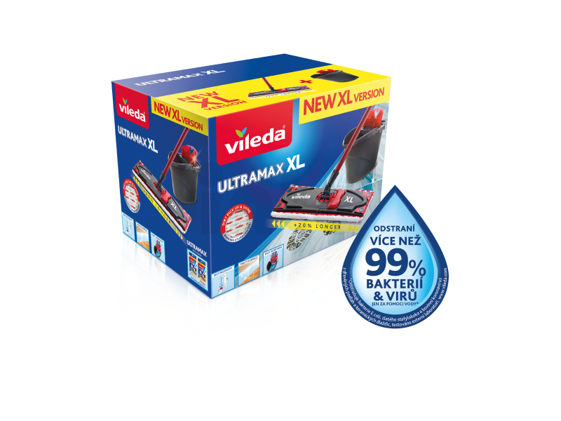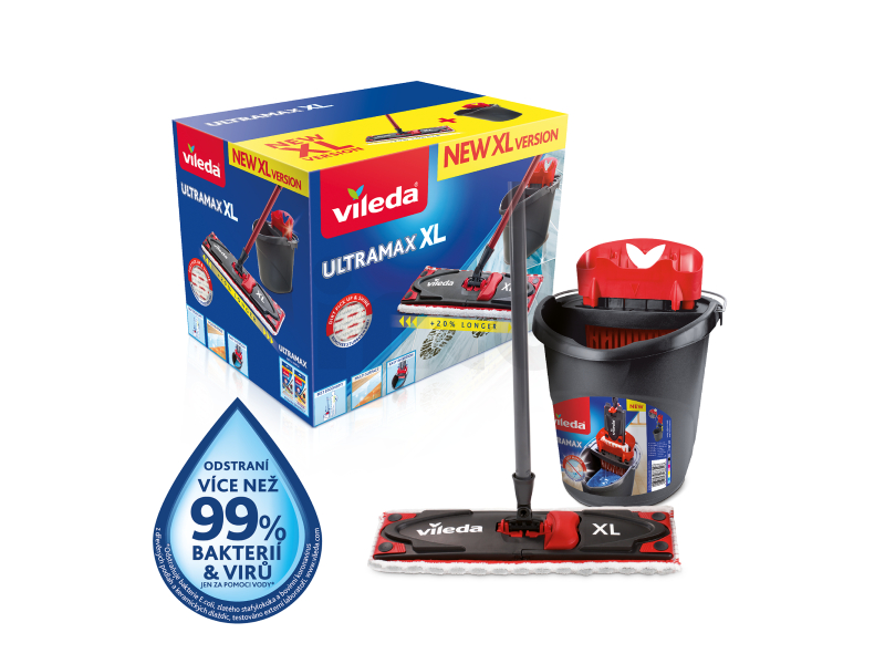 Set Vileda Ultramax XL obsahuje hlavici, na kterou připevníte mycí návlek z mikrovláken, 3-dílnou šroubovací tyč a kbelík se ždímacím košem. Hlavice mopu je o 20% delší ve srovnání s hlavicí mopu Vileda Ultramax, což znamená rychlejší úklid větších ploch. Je vhodný na všechny typy tvrdých podlah. Mycí návlek, který kombinuje mikrovlákna a abrazivní vlákna a zajišťuje bezchybné sbírání nečistot a prachu a zároveň zanechává vaše podlahy zářivé. Výborně odstraňuje i odolné nečistoty a je schopen vyčistit i obtížnější a odolnější skvrny.Unikátní Power zóna pomáhá odstranit špínu s minimálním úsilím a přitom udržuje ruce v suchu. Jeho rukojeť a otočná hlavice nabízejí větší rozsah pohybů, takže můžete mopem plynule přejíždět po soklech, pod nábytkem a v rozích.Praktická hlavice mopu je otočná o 360 ° a umožňuje snadné čištění pod vaším nábytkem a zajišťuje skvělý zážitek z úklidu. Už žádné ohýbání, žádné mokré a špinavé ruce. Jakmile vyzkoušíte tento nový způsob čištění, už se nikdy nebudete chtít vrátit ke starým technikám. Získejte svůj vlastní set Vileda Ultramax XL ještě dnes a mějte z úklidu lepší zážitek!