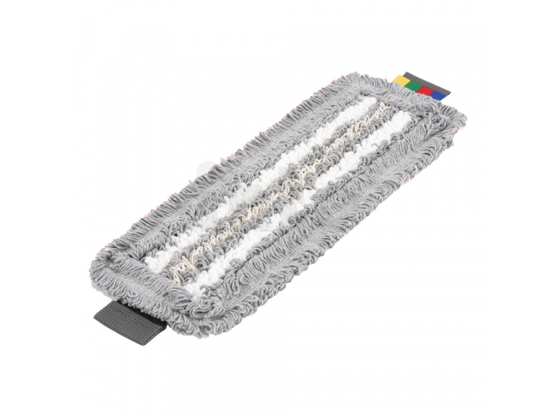 Barevné kódování je zajištěno všitými barevnými štítky (nevhodné štítky se odstřihnou). Upevnění mopu do držáku pásky je nejpohodlnějším a bezpečným systémem, usnadňuje a urychluje manipulaci.