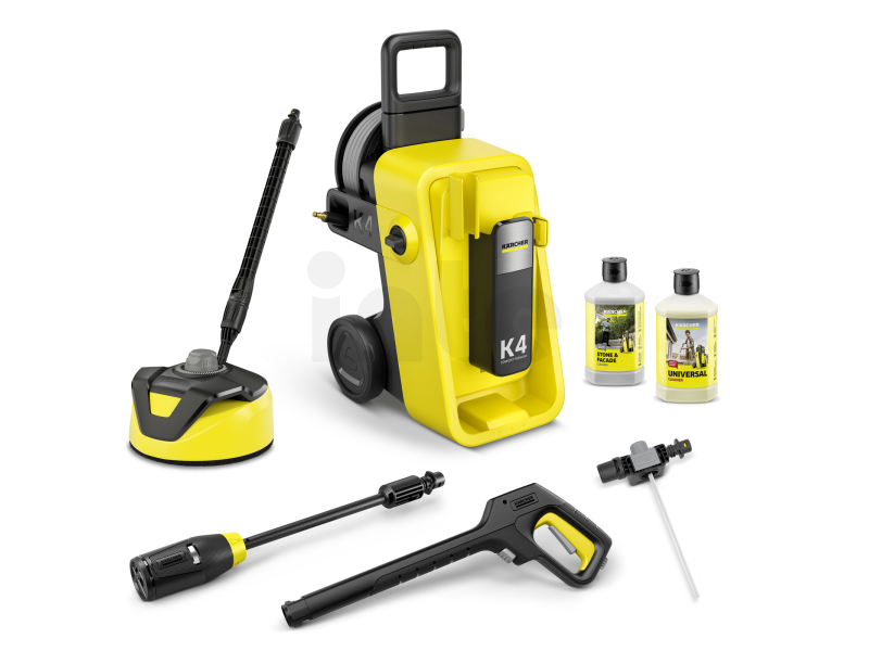 Vysokotlakový čistič KÄRCHER K 4 Comfort Premium Home nabízí výkonné čištění, hadici PremiumFlex s navijákem, multifunkční trysku 4-v-1 a Home Kit pro pohodlné čištění domu i auta.