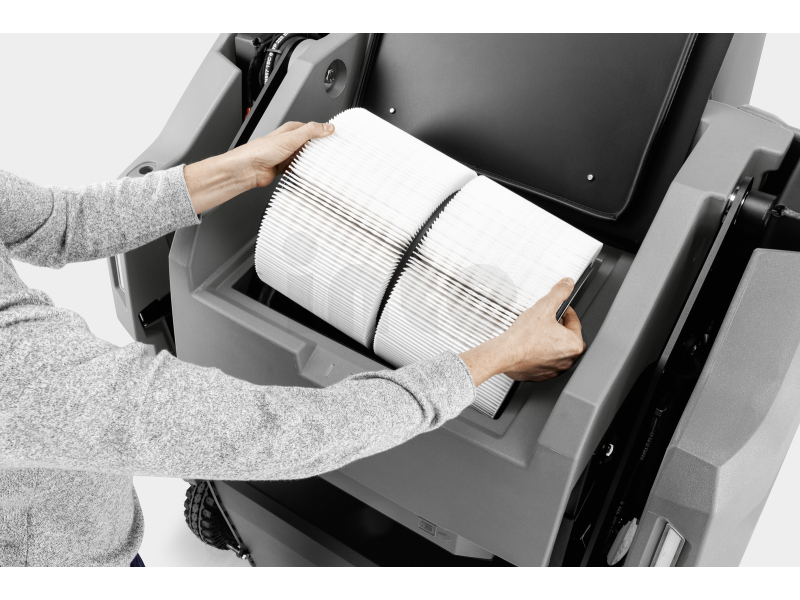 O čisté pracovní prostředí se stará kruhový filtrační systém s velkou filtrační plochou 6 m² a automatickým čištěním filtru, který minimalizuje víření prachu během zametání a prodlužuje životnost filtru až na dvojnásobek. Sklopné boční kartáče chrání nábytek i samotný stroj při práci v interiéru.